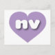 Esta postal presenta un corazón de lavanda con forma y vibrante que contiene las letras fundas nv, negrita, blanca y redondeada, una abreviatura divertida para Nevada, el estado plateado. El reverso de la postal está en blanco, esperando el texto personalizado o los sentimientos manuscritos.