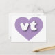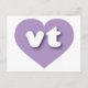 Esta postal contiene un corazón de lavanda que contiene las letras fundas vt redondeadas, blancas y redondeadas, una abreviatura divertida para Vermont, el estado montañoso verde. El reverso de la tarjeta está en blanco, esperando el texto personalizado o los sentimientos escritos a mano.