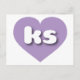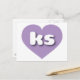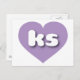 Esta postal presenta un corazón de lavanda con forma y vibrante que contiene las letras negrita, blanca, redondeadas de los fundas inferiores, una abreviatura divertida para Kansas, el estado de los girasoles. El lado inverso de la postal está en blanco, a la espera de tus sentimientos escritos a mano o de tu texto personalizado.
