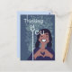 Una chica linda haciendo un signo de corazón con patrones florales en el fondo. ¡Un divertido y cariñoso patrón floral azul diseñado para una tarjeta de Pensando en Ti!