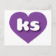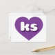 Esta postal tiene un corazón morado claro y vibrante que contiene las letras negrita, blanca, redondeadas de los fundas inferiores, una abreviatura juguetona para Kansas, el estado de los girasoles. El lado inverso de la postal está en blanco, a la espera de tus sentimientos escritos a mano o de tu texto personalizado.