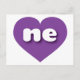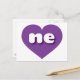 Esta postal presenta un vibrante corazón púrpura que contiene letras fundas negras, redondeadas, blancas y bajas, una versión lúdica de la abreviatura de Nebraska, el estado de la cascarilla. El lado inverso de la postal está en blanco, a la espera de tus sentimientos escritos a mano o de tu texto personalizado.