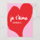 Postal Corazón rojo con je t’aime-text sobre fondo rosado