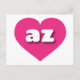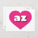 Esta postal presenta un vibrante corazón rosado caliente que contiene las letras fundas más bajas, redondeadas, blancas y negrita, una versión divertida de la abreviatura de Arizona, el estado del Gran Cañón. El reverso de la postal está en blanco, esperando el texto personalizado o los sentimientos manuscritos.