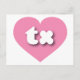 Esta postal tiene un corazón tranquilo y fresco de color rosa que contiene las letras negrita, blanca, redondeadas de funda inferior tx, una abreviatura juguetona para Texas, el estado de la estrella solitaria. El reverso de la postal está en blanco, esperando el texto personalizado o los sentimientos escritos a mano.