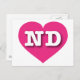 Esta tarjeta postal contiene un vibrante corazón rosado caliente que contiene las letras negrita, blanca, alta funda ND, la abreviatura oficial de Dakota del Norte, el estado del jardín de paz. El lado inverso de la postal está en blanco, a la espera de tus sentimientos escritos a mano o de tu texto personalizado.