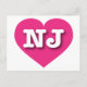Esta postal tiene un vibrante corazón rosado caliente que contiene las letras negrita, blanca y alta del funda NJ, la abreviatura oficial de Nueva Jersey, el estado del jardín. El reverso de la postal está en blanco, esperando el texto personalizado o los sentimientos manuscritos.
