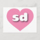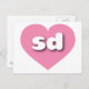 Esta postal tiene un corazón tranquilo y fresco de color rosa que contiene las letras negrita, blanca, redondeadas de funda inferior sd, una abreviatura divertida para Dakota del Sur, el estado de Mount Rushmore. El lado inverso de la postal está en blanco, a la espera de tus sentimientos escritos a mano o de tu texto personalizado.