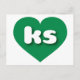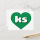 Esta postal cuenta con un vibrante corazón verde que contiene las letras negrita, blanca, redondeadas de los fundas inferiores, una abreviatura juguetona para Kansas, el estado de los girasoles. El reverso de la postal está en blanco, esperando el texto personalizado o los sentimientos escritos a mano.
