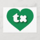 Esta postal cuenta con un corazón verde vibrante que contiene las letras fundas tx, negrita, blanca y redondeada, una abreviatura juguetona para Texas, el estado de la estrella solitaria. El reverso de la tarjeta está en blanco, esperando tu texto personalizado o tus sentimientos escritos a mano.
