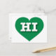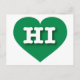 Esta postal contiene un vibrante corazón verde que contiene las letras negrita, blanca y alta del funda HI, la abreviatura oficial de Hawaii, el estado de aloha. El lado inverso de la postal está en blanco, a la espera de tus sentimientos escritos a mano o de tu texto personalizado.