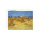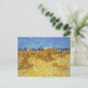 Una excelente postal artística con la pintura post-impresionista del artista holandés Vincent van Gogh (1853-1890), Corn Harvest en Provenza (1888), Un paisaje de campo en Francia después de la cosecha de otoño con un brillante cielo azul.