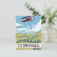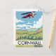 Cartel de viaje de estilo vintage precioso de un biplano rojo retro volando sobre el paisaje de Cornwall para unas vacaciones.