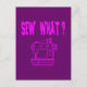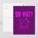Tarjeta de nota de saludo de postal impresa con ¿Sew What? texto de palabra creativa, frase, juego de palabras, signo de interrogación y diseño gráfico de máquina de coser ilustrado por la tienda de impresión bajo demanda TheFabricSeal en Zazzle.com #ZazzleMade https://www.zazzle.com/store/thefabricseal TheFabricSeal Original.