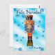 Un petardo alemán tradicional que representa a un militar con uniforme azul y naranja. El petardo es superpuesto en una imagen de fondo azul con copos de nieve. También aparece texto en español que dice "Feliz Navidad". Añade tu propio texto adicional.
