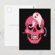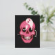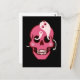 Postal de calavera con un ilustracion personalizado de un divertido cráneo rosa con pómulos de color rosa y dos fantasmas bonitos en los orificios de los ojos observándose unos a otros y una pequeña araña adorable sonriente sobre uno de estos amigos miedosos. Este divertido diseño macabro tiene colores vivos rosados y negros.