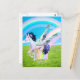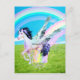 Una pintura digital de un colorido unicornio volador aterrizando en el césped después de crear arcos en el cielo con su magia.