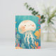 This heartwarming design features an incredibly sweet and round cream-colored jellyfish shown swimming joyfully through a vibrant underwater paradise. The jellyfish has a soft, textured bell with a blissfully happy face, closed eyes, and bright orange rosy cheeks. Its long, wavy white tentacles flow gracefully through the crystal-clear teal and turquoise water. The character is surrounded by a lush garden of stylized pink, orange, and yellow coral reefs at the bottom of the frame. Beams of bright golden sunlight filter down from the surface, illuminating the scene and creating a cheerful, magical atmosphere. The overall aesthetic is bright, cozy, and full of wonder, making it an irresistible choice for fans of marine life and playful ocean art. This cheerful jellyfish postcard is a wonderful choice for sending a warm "thinking of you" note or a sun-drenched greeting to a friend who finds joy in the colorful magic of the sea. You might choose to use this artistic card for an under-the-sea themed birthday invitation or as a sweet way to share news of a summer beach trip with your family. It also makes a precious decorative piece for a child's nursery wall or a bright addition to a creative scrapbooking project as a small token of aquatic happiness. This versatile design is also an excellent choice for a holiday thank you note, a graduation message, or as a heartwarming way to share a message of joy for any situation or event.