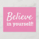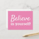 Cita motivacional, inspiradora, "¡Cree en ti mismo!" Esta es una postal con palabras de sabiduría para vivir a diario. El diseño tiene un tipo de letra blanco sobre fondo rosado. Los colores tanto del tipo de letra como del fondo se pueden personalizar fácilmente en la sección de herramientas de diseño de Zazzle. Otros diseños disponibles.