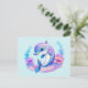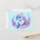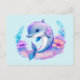 Una postal con un ilustracion adorable. Un delfín azul y púrpura rodeado de flores submarinas de color bonito.