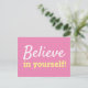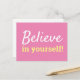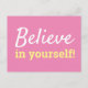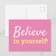 Envía un poco de ánimo en su dirección con esta tarjeta postal motivadora “¡Cree en Ti Misma!”. El suave fondo rosa y la tipografía blanca y amarilla crean un aspecto suave y moderno perfecto para notas inspiradoras, mensajes cotidianos o correo reflexivo para alegrar su día. Personaliza los colores o el texto en la herramienta de diseño de Zazzle para hacerlo único.