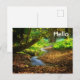 Postal con un bosque verde y brillante con una cala sinuosa de bonito. Las hojas marrones cubren el suelo del bosque, lo que aporta un agradable contraste con la exuberante vegetación de estos mágicos bosques.