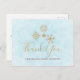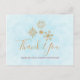 Tarjeta de agradecimiento con una ilustración de copos de nieve dorados elegantes con formas cristalinas. Un fondo azul claro helado. Mensaje personalizado en el reverso.