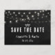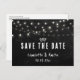 Boda rústica en pizarra negra salva las postales de fecha con luces de cuerda en un fondo negro de pizarra.