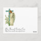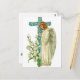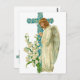 pintura vintage de un ángel de blanco rezando delante de una cruz de flores azules.