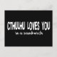 Para los fans de H. P. Lovecraft, Cthulhu es una fuente interminable de humor satírico y amor demente. Difunde tu compulsión con este simple mensaje que es una agradable burla de la bendición de Jesús: "Cthulhu te ama...en un sándwich".