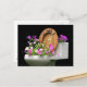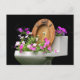 Postal con foto humorística. Cuando la vida te da popó hacer fertilizante. Ánimo, reciclar, etc. Petunias creciendo en un viejo retrete