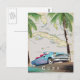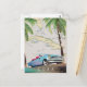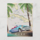 Mapa ilustrado de Cuba (más las islas circundantes) en un hermoso estilo vintage detallado con un clásico auto cubano antiguo al atardecer.