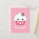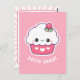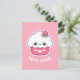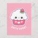 Un bizcocho de fresa muy lindo con cara feliz y amigo brillante de fresa. Personaliza con tu propio texto.