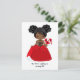 Invitación de cumpleaños con una pequeña princesa negra con vestido de mariquita y tipografía de mariquita adorable en el reverso.