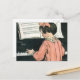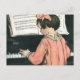 Ilustracion vintage de Jessie Willcox Smith, famosa ilustradora para niños, que presenta a una niña pianista practicando sus clases de piano. Hay una partitura de papel en el piano y ella lleva puesto un vestido rosa con un arco en el pelo.