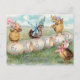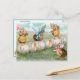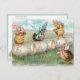 Alegres y lindas chicas de época usando lujosos bonitos de Pascua con huevos que escriben "Saludos de Pascua".