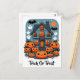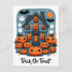 Fun Halloween Trick Or Treat postal con un encantador ilustracion de Halloween mostrando una casa caprichosamente embrujada con ventanas naranjas, rodeada de calabazas sonrientes. Fantasmas amistosos flotan en el cielo nocturno mientras los murciélagos agregan un toque de diversión espeluznante. La divertida mezcla de miedosos y adorables capta la alegría de la temporada de trucos o dulces. Un diseño festivo para los amantes de la magia de Halloween.