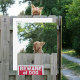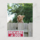 Cuidado con el perrito adorable como este Yorkshire Terrier. Irónicamente este Yorkie diminuto es más pequeño que el letrero de "Cuidado con el perro". Los amantes de los perros amarán esta tarjeta postal.