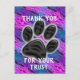 Ya sea que sea una oficina veterinaria, un peluquero o un paseador de perros, promueva su negocio con una postal económica. Esta postal de agradecimiento al cliente presenta una gran huella de pata negra sobre un fondo a rayas diagonales de azul y morado. "Gracias por su confianza" se puede personalizar de forma rápida y sencilla si lo desea.