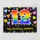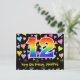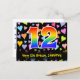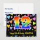 El frente de este diseño de tarjeta postal temática de cumpleaños emocionante, cariñoso y divertido presenta un gran número "12" con un patrón inspirado en gradiente de espectro de arcoíris. También presenta el mensaje "Feliz cumpleaños 12" y un nombre de destinatario personalizable. La parte delantera también tiene un patrón vibrante y colorido de formas de corazón cariñosas. La parte trasera presenta un mensaje de saludo de cumpleaños editable, o quizás podría borrarse y dejarse en blanco si se desea escribir un mensaje a mano en su lugar. Una tarjeta postal de cumpleaños personalizada como esta podría ser una forma divertida de enviar un mensaje para celebrar el duodécimo cumpleaños de alguien. Tarjetas postales como esta también podrían utilizarse para invitar a los invitados a una fiesta de cumpleaños que se celebra para alguien que cumple 12 años. [~Z0000448]