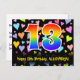 El frente de este diseño de tarjeta postal temática de cumpleaños divertida y emocionante presenta un gran número "13" con un patrón inspirado en el gradiente del espectro del arcoíris, junto con el mensaje "Feliz cumpleaños 13", y un nombre de destinatario personalizable. La parte delantera también tiene un colorido y vibrante patrón de fondo de formas de corazón amorosas. La parte trasera presenta un mensaje de saludo de cumpleaños personalizado, o quizás podría estar en blanco si se desea escribir un mensaje a mano en su lugar. Una tarjeta postal de cumpleaños personalizada como esta podría ser una forma divertida de reconocer el cumpleaños de alguien. Las tarjetas postales como esta también podrían utilizarse para invitar a los invitados a una fiesta de cumpleaños que se celebra para alguien que cumple 13 años.
