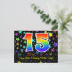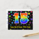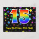 El frente de este diseño de tarjeta postal temática de cumpleaños colorida, divertida y emocionante presenta un gran número "15" con un patrón de gradiente de espectro de arcoíris. También presenta el mensaje "Feliz cumpleaños 15" y un nombre de destinatario personalizado. La parte delantera también presenta un patrón de fondo vibrante y colorido con formas de estrellas de diferentes tamaños. La parte posterior presenta un mensaje de saludo de cumpleaños personalizado, o quizás podría estar en blanco si se va a escribir un mensaje a mano en su lugar. Una tarjeta postal de cumpleaños personalizable como esta podría ser una forma divertida de enviar un mensaje para celebrar el decimoquinto cumpleaños de alguien. Tarjetas postales como esta también podrían usarse para invitar a invitados a una celebración de cumpleaños o fiesta que se celebra para alguien que cumple 15 años.