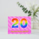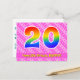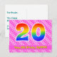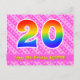 El frente de este diseño de tarjeta postal temática de cumpleaños feliz, alegre y cariñosa presenta un gran número "20" con un patrón de gradiente de espectro de arcoíris, junto con el mensaje "Feliz cumpleaños 20", y un nombre de destinatario personalizable. El frente presenta adicionalmente un patrón feliz de rayas rosadas claras y oscuras que contienen formas de corazón. La parte trasera presenta un mensaje de saludo de cumpleaños personalizable, o quizás podría estar en blanco si se va a escribir un mensaje a mano en su lugar. Una tarjeta postal de cumpleaños personalizable como esta podría ser una forma divertida de enviar un mensaje para celebrar el vigésimo cumpleaños de alguien. Tarjetas postales como esta también podrían usarse para invitar a invitados a una celebración de cumpleaños o fiesta que se celebra para alguien que cumple 20 años.
