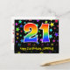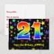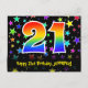 El frente de este diseño de tarjeta postal temática de cumpleaños, colorido, divertido y emocionante, presenta un gran número "21" con un patrón inspirado en el gradiente del espectro del arcoíris, junto con el mensaje "Feliz cumpleaños 21", y un nombre de destinatario personalizado. La parte delantera presenta además un fondo colorido y vibrante con un patrón de formas de estrellas. La parte trasera presenta un mensaje de saludo de cumpleaños personalizado, o quizás podría estar en blanco si se desea escribir un mensaje a mano. Una tarjeta postal de cumpleaños personalizada como esta podría ser una forma divertida de enviar un mensaje para celebrar el cumpleaños número veintiuno de alguien. Las tarjetas postales como esta también podrían usarse para invitar a los invitados a una celebración de cumpleaños o fiesta que se organice para alguien que cumpla 21 años.