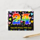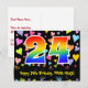 El frente de este diseño de tarjeta postal temática de cumpleaños, amoroso, emocionante y divertido, presenta un gran número "24" con un patrón de gradiente de espectro de arcoíris. También presenta el mensaje "Feliz cumpleaños 24" y un nombre de destinatario personalizado. La parte delantera también tiene un patrón vibrante y colorido de corazones amorosos. La parte trasera presenta un mensaje de saludo de cumpleaños editable, o quizás podría borrarse y dejarse en blanco si se desea escribir un mensaje a mano. Una tarjeta postal de cumpleaños como esta podría ser una forma divertida de enviar deseos de cumpleaños a alguien que está celebrando su cumpleaños número veinticuatro. Tarjetas postales como esta también podrían usarse para invitar a invitados a una celebración de cumpleaños o fiesta que se organice para alguien que cumple 24 años. [~Z0000448]