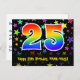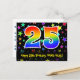 El frente de este diseño de tarjeta postal temática de cumpleaños colorida, divertida y emocionante presenta un gran número "25" con un patrón de gradiente de espectro de arcoíris. También presenta el mensaje "Feliz cumpleaños 25" y un nombre de destinatario personalizable. La parte delantera también tiene un patrón colorido y vibrante de formas de estrellas. La parte trasera presenta un mensaje de saludo de cumpleaños editable, o quizás podría estar despejado y dejado en blanco si se va a escribir un mensaje a mano en su lugar. Una tarjeta postal de cumpleaños personalizada como esta podría ser una forma divertida de enviar un mensaje para celebrar el vigésimo quinto cumpleaños de alguien. Las tarjetas postales como esta también podrían utilizarse para invitar a los invitados a una fiesta de cumpleaños que se celebra para alguien que cumple 25 años.