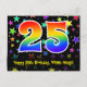 El frente de este diseño de tarjeta postal temática de cumpleaños colorida, divertida y emocionante presenta un gran número "25" con un patrón de gradiente de espectro de arcoíris. También presenta el mensaje "Feliz cumpleaños 25" y un nombre de destinatario personalizable. La parte delantera también tiene un patrón colorido y vibrante de formas de estrellas. La parte trasera presenta un mensaje de saludo de cumpleaños editable, o quizás podría borrarse y dejarse en blanco si se desea escribir un mensaje a mano en su lugar. Una tarjeta postal de cumpleaños personalizada como esta podría ser una forma divertida de enviar un mensaje para celebrar el vigésimo quinto cumpleaños de alguien. Las tarjetas postales como esta también podrían usarse para invitar a los invitados a una fiesta de cumpleaños que se celebra para alguien que cumple 25 años. [~Z0000447]