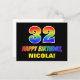 El frente de este divertido, colorido y alegre diseño de tarjeta postal temática de cumpleaños presenta un gran número "32" y el mensaje "FELIZ CUMPLEAÑOS", ambos con un patrón de colorido gradiente de espectro de arcoíris, junto con un nombre del destinatario editable en amarillo negrita. La parte delantera también tiene un fondo simple, minimalista, de color negro. La parte posterior de la tarjeta postal tiene un mensaje de felicitación de cumpleaños editable, o quizás podría estar en blanco si se desea escribir un mensaje a mano. Una tarjeta postal de cumpleaños personalizada y emocionante como esta podría ser una forma divertida de enviar un mensaje para celebrar el cumpleaños número treinta y dos de alguien.