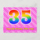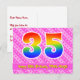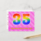 El frente de este diseño de tarjeta postal con tema de cumpleaños feliz, amoroso y alegre presenta un gran número "35" con un patrón inspirado en gradiente de espectro de arcoíris. También presenta el mensaje "Feliz cumpleaños 35" y un nombre de destinatario personalizable. La parte delantera presenta además un patrón alegre a rayas rosa oscuro y rosa claro con formas de corazón. La parte trasera presenta un mensaje de saludo de cumpleaños editable, o quizás podría estar despejado y dejado en blanco si se desea escribir un mensaje a mano en su lugar. Una tarjeta postal de cumpleaños personalizable como esta podría ser una forma divertida de enviar un mensaje en celebración del cumpleaños número treinta y cinco de alguien. Tarjetas postales como esta también podrían usarse para invitar a los invitados a una fiesta de cumpleaños que se celebra para alguien que cumple 35 años.