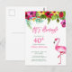 Establece el tono para una divertida celebración de cumpleaños número 40 veraniega con esta linda tarjeta postal de invitación de fiesta tropical "¡Vamos a Flamingle!" con un brillante y tropical floral acuarela de colorido hibisco, cepillo de botella, ave del paraíso brillante y follaje de palma, seguido de "Vamos a Flamingle" en rosa flamingo. Personalizado en la parte frontal con texto de rosa y verde a juego. Derechos de autor Elegant Invites, todos los derechos reservados